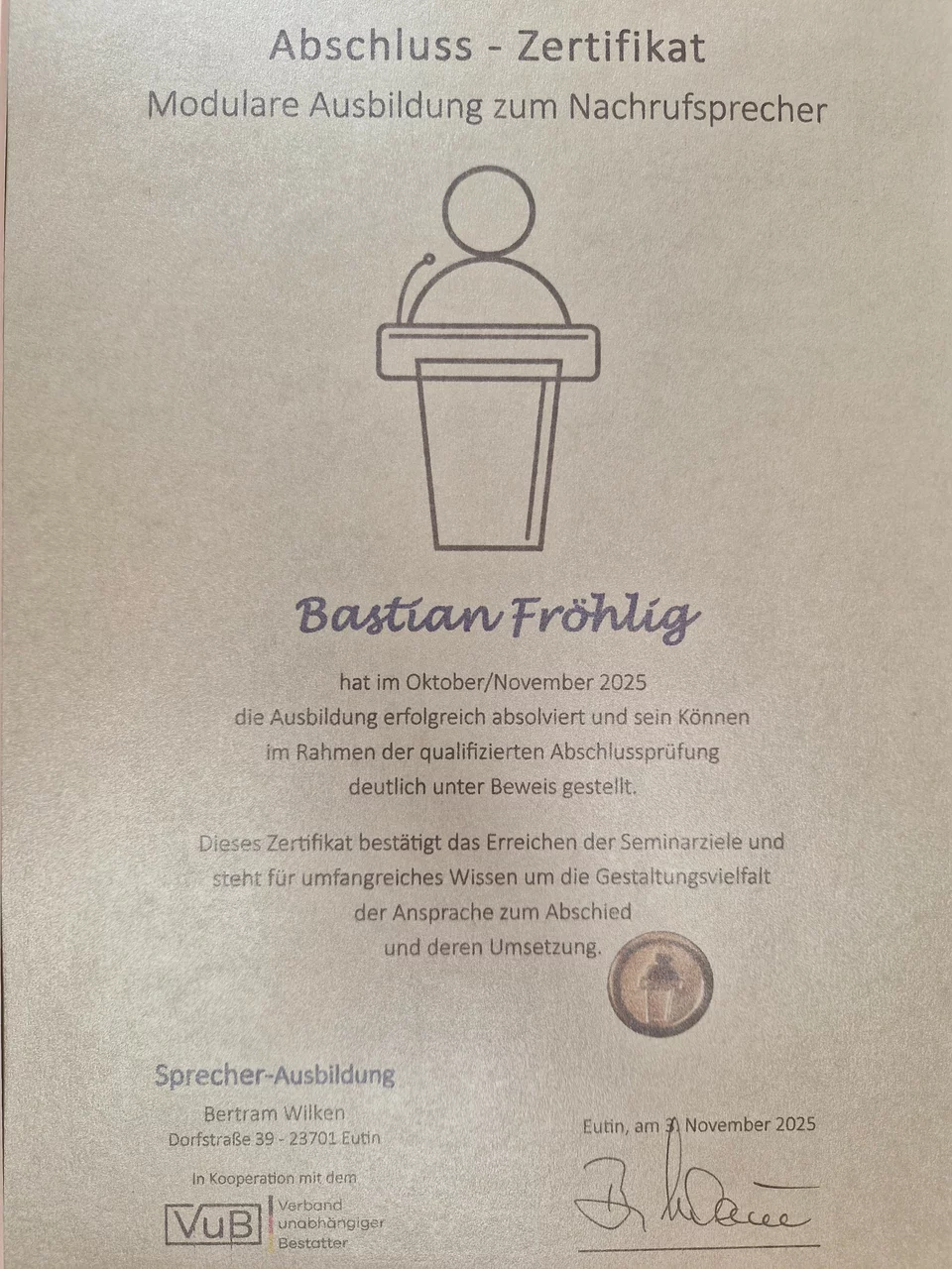 Auf meinem Lebensweg habe ich gelernt, Geschichten auf vielfältige Weisen zu schreiben und zu erzählen – und die besten Anekdoten liefern einfach Menschen. Bei Trauerredner Bertram Wilken habe ich 2025 die zertifizierte Ausbildung zum Nachruf-Sprecher absolviert.